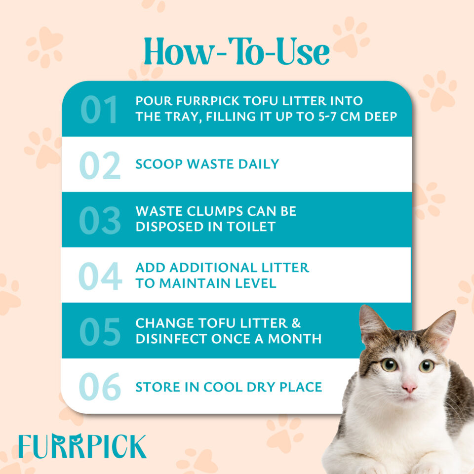 - Pour Furrpick Tofu Litter into the tray, filling it up to 5-7 cm deep